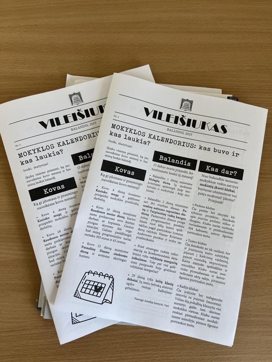 Nuo 2013 iki 2016 metų progimnazijoje buvo leidžiamas mokinių ruošiamas laikraštis, kuriame nuguldavo smagiausių mokyklos renginių, įvykių bei kitokių naujienų aprašymai bei straipsniai. Dabar, po beveik 10 metų, lietuvių kalbos mokytojos Ugnės, socialinės pedagogės Dovilės ir mokinių savivaldos atstovų bei kitų aktyvių mokinių – Agotos, Amelijos, Beatričės, Emilės, Radvilės, Urtės, Viktorijos ir Žemynos – noro ir įsitraukimo dėka laikraštis vėl pradeda gyvuoti. Mokyklos bendruomenės nariams jau pasiekiamas pirmasis šių metų numeris. Pavartykite!